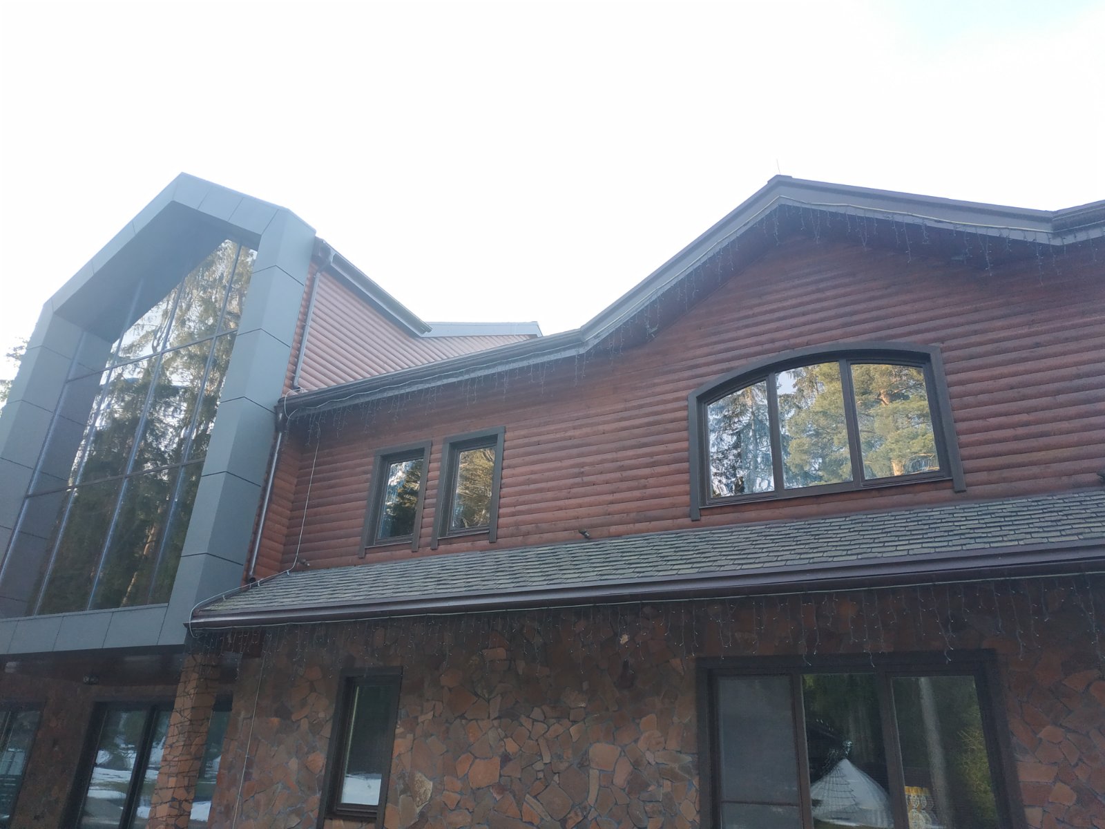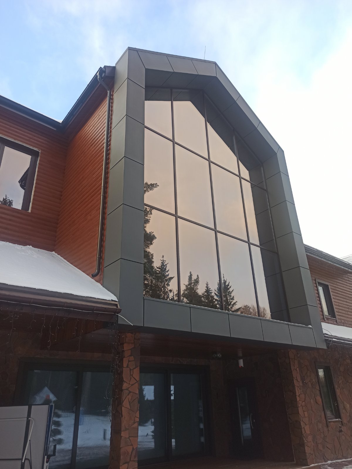 В результат мы видим древесный фасад, в контрасте с коричнево-матовым алюминиевым профилем RAL8017|30.